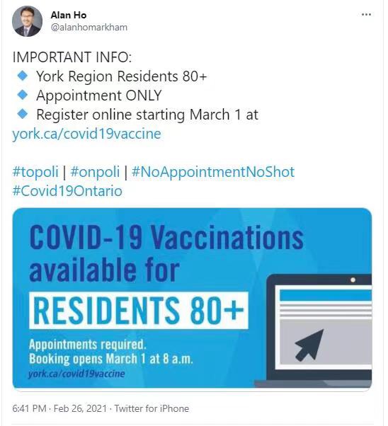 以下是我们万锦市何胡锦议员发出的关于约克区八十岁以上居民三月一号开始线上疫苗预约登记的通知,希望有符合资格的家庭尽快注册登记。