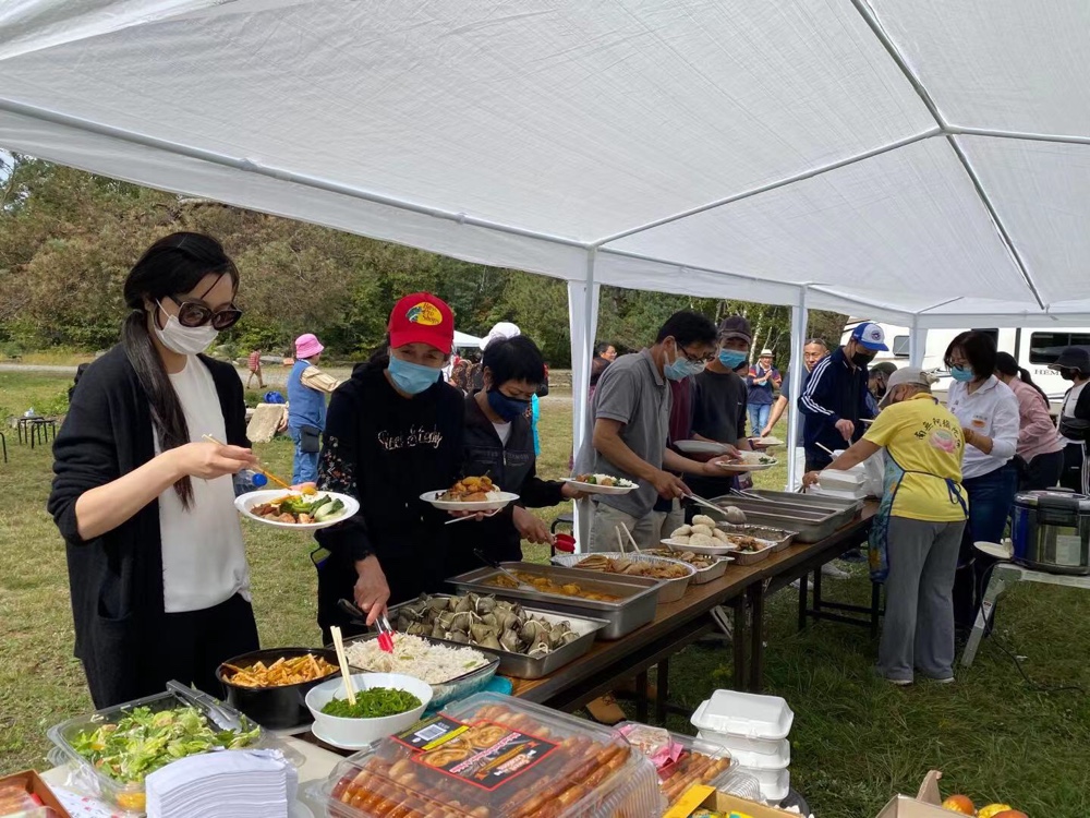 時間來到11點半,香積廚義工已為大家備好美味可口的午餐,還有發心的法友信眾從家裡帶來了食物、飲料、水果等和大家一起分享,每個人在其樂融融當中,在由大家努力搭起的帳篷裡,在綠茵茵的草地上享用豐盛的午齋,讚不絕口素食的美味。