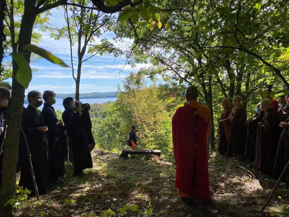 住持照續和尚和法友信眾們講述著靈山的因緣說道,多少年來和尚一直有個心願,希望在加拿大能建立一個像中國蘇州靈嚴山一樣的道場,由於和尚出自蘇州靈巖山道場,所以當和尚來到這裡的時候,發現此地山形和環境和當年在的靈嚴山何其相似,真是不可思議!大家無比讚嘆,紛紛合影留念。山間還有居士發心書寫的靈山紅墨,佛句禪語,更增添了濃厚的佛教氛圍。