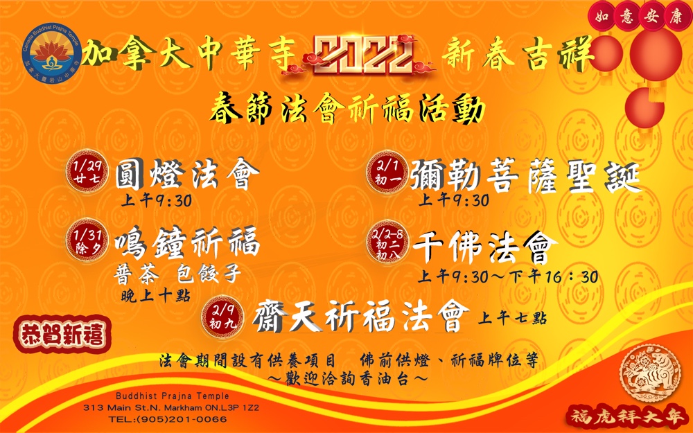 加拿大中華寺訂於2022年2月1日舉行新春吉祥禮拜三千佛祈福法會。誠邀您共同參與殊勝法會,同沾法喜,共獲法益。