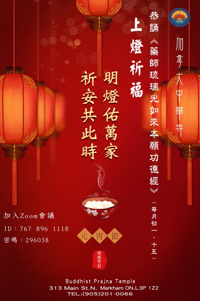 農歷正月十五元宵佳節,加拿大中華寺於上午九點舉行恭誦《藥師琉璃光如來本願功德經》一部,並舉辦「供燈傳燈祈福法會」。