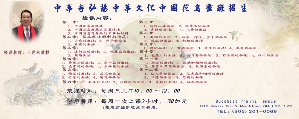 为了推动中国传统文化艺术在加拿大的弘扬与传承,提高研修书画者的专业水平,特举办《2022年春季花鸟画基础班》。