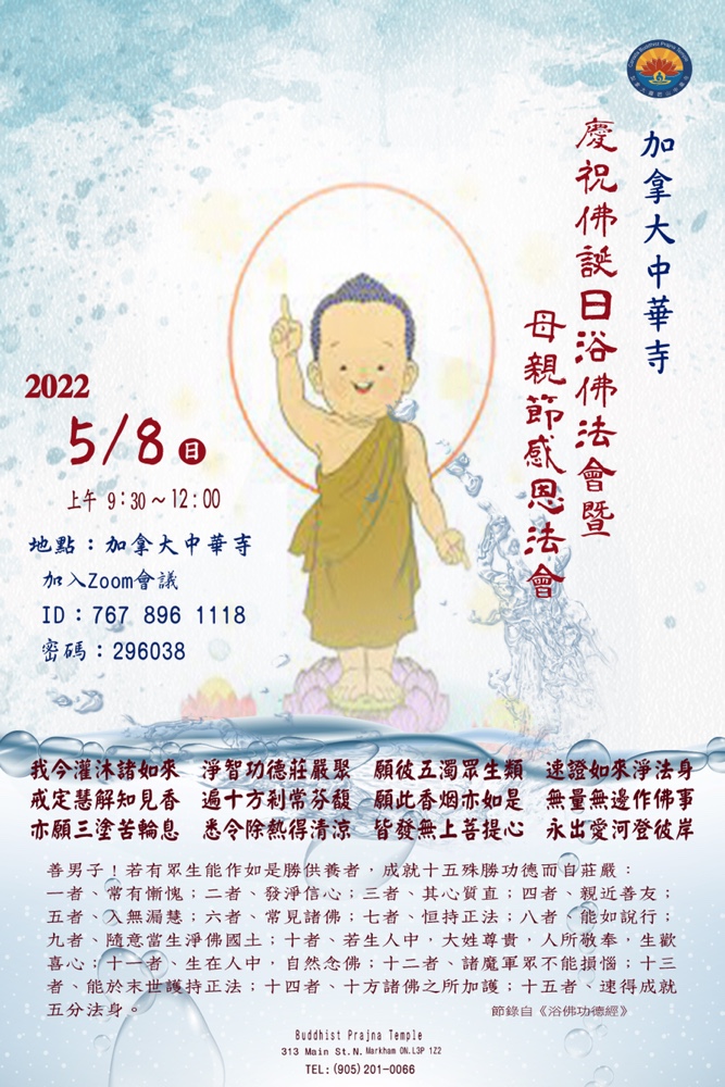 五月是充滿感恩的月份,是佛曆2566年感念本師釋迦佛尼佛為了一切有情而誕生於娑婆世界的恩德,降生示現於人間的日子,亦是正值母親節,是報父母恩的好時機,表達對母親生養我們由衷的感謝。加拿大中華寺在此殊勝之日以供燈為三寶長久住世之祈請,亦為母親們免費供燈以智慧光明能除一切苦難得以究竟解脫。謹訂於五月八日上午九點三十分開始,於中華寺大雄寶殿舉行一年一度的浴佛法會,在浴佛偈中「我今灌沐諸如來」表示不只灌沐一尊佛,而是十方三世一切佛。歡迎十方善信法友一同回寺參與法會浴佛,得大善根獲大善果。以此功德回向三寶慈光加被,以此法會共修功德,上報四恩,下濟三有;並回向祈願世界和平,國泰民安,疫情消除,社會和諧,世界和平法界有情,同霑法益,共證菩提。
