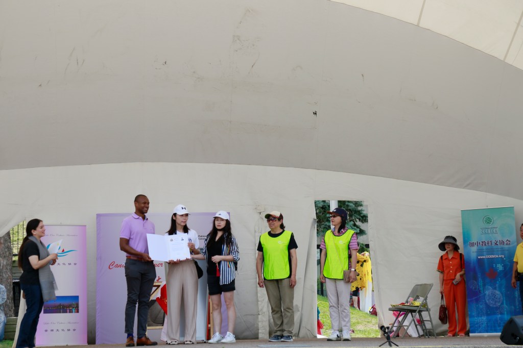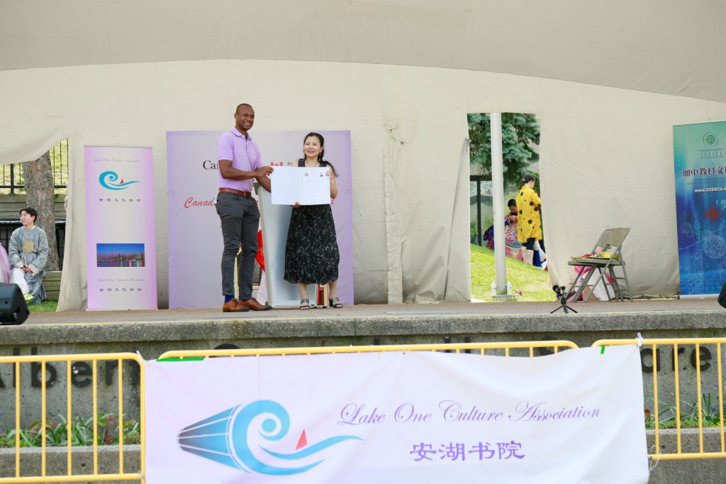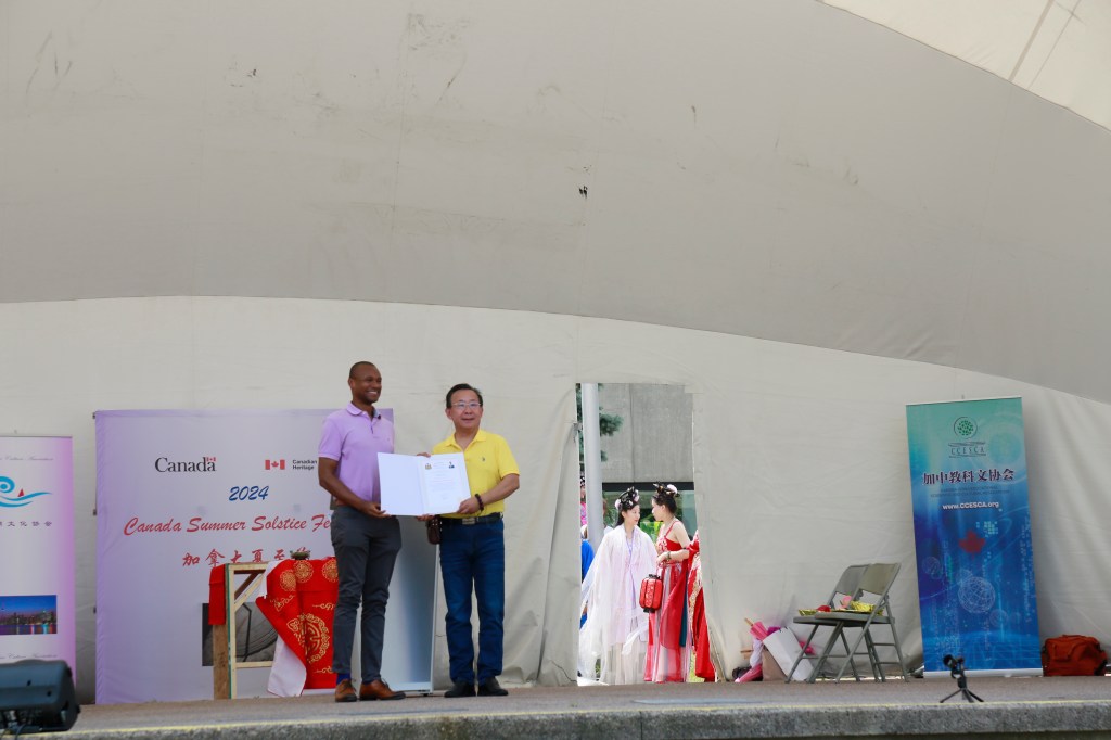 协办方加中教科文协会会长刘莹在发言中说,站在台上看着台下夏至文化节丰富多彩充满传统中华文化色彩又有现代气息的摊位、装置和场景,各族裔其乐融融乐在其中的情景,感到非常开心和自豪,并邀请现场所有人为组织者和义工点赞!她说,夏至文化节的目标与其协会的愿景高度一致,加中教科文协会的使命就是通过教育、科学和文化交流促进不同文化之间的理解与交融。夏至节这样一个可以融合多族裔社区共同欢乐共同庆祝的节日,值得我们大家在加拿大这样一个倡导多元文化繁荣发展的国家去共同发扬光大,一年一年的办下去。加中教科文协会自2012年成立以来主办过三届【加中电子商务暨高科技峰会/论坛/展会】、【五洲同乐】、【哈佛大学丁汤力人声合唱团多伦多巡演暨座谈会】等多场大型国际科技、文化、教育活动,并多次参与慈善义演,为加拿大的多元文化繁荣、经济发展及社区进步做出了积极贡献。