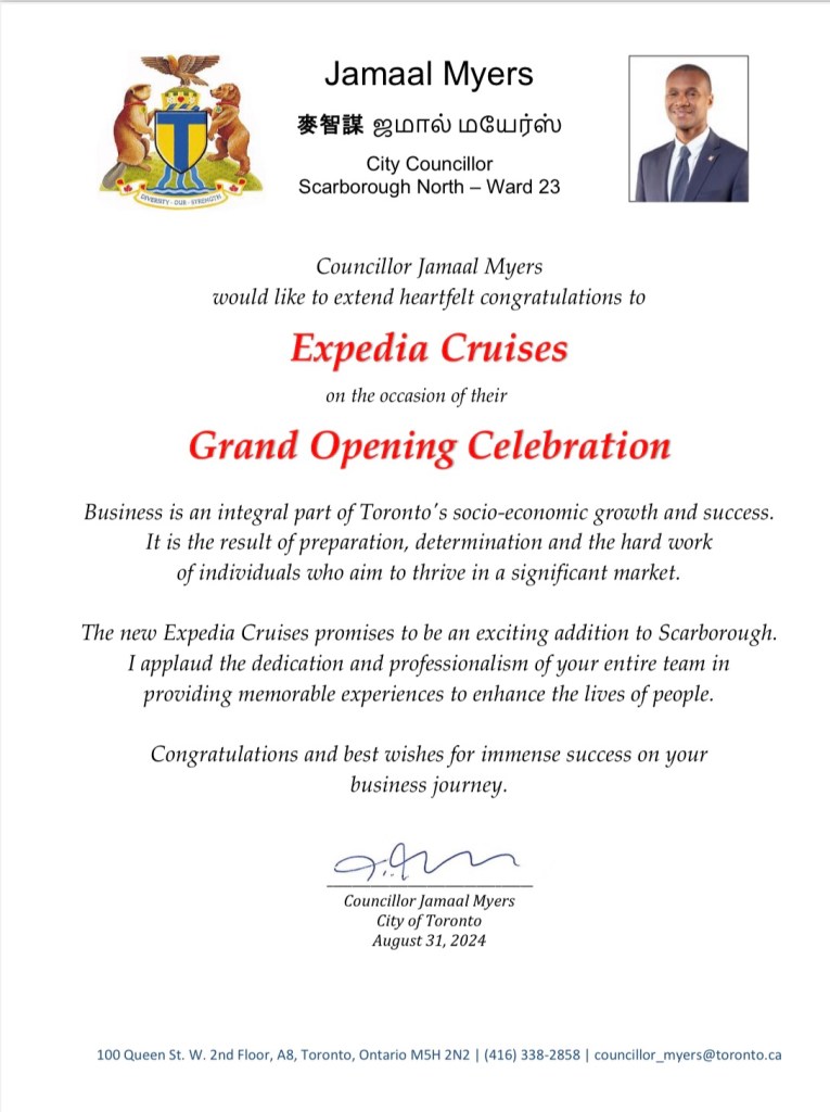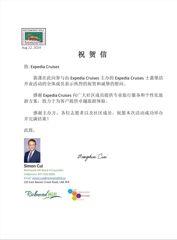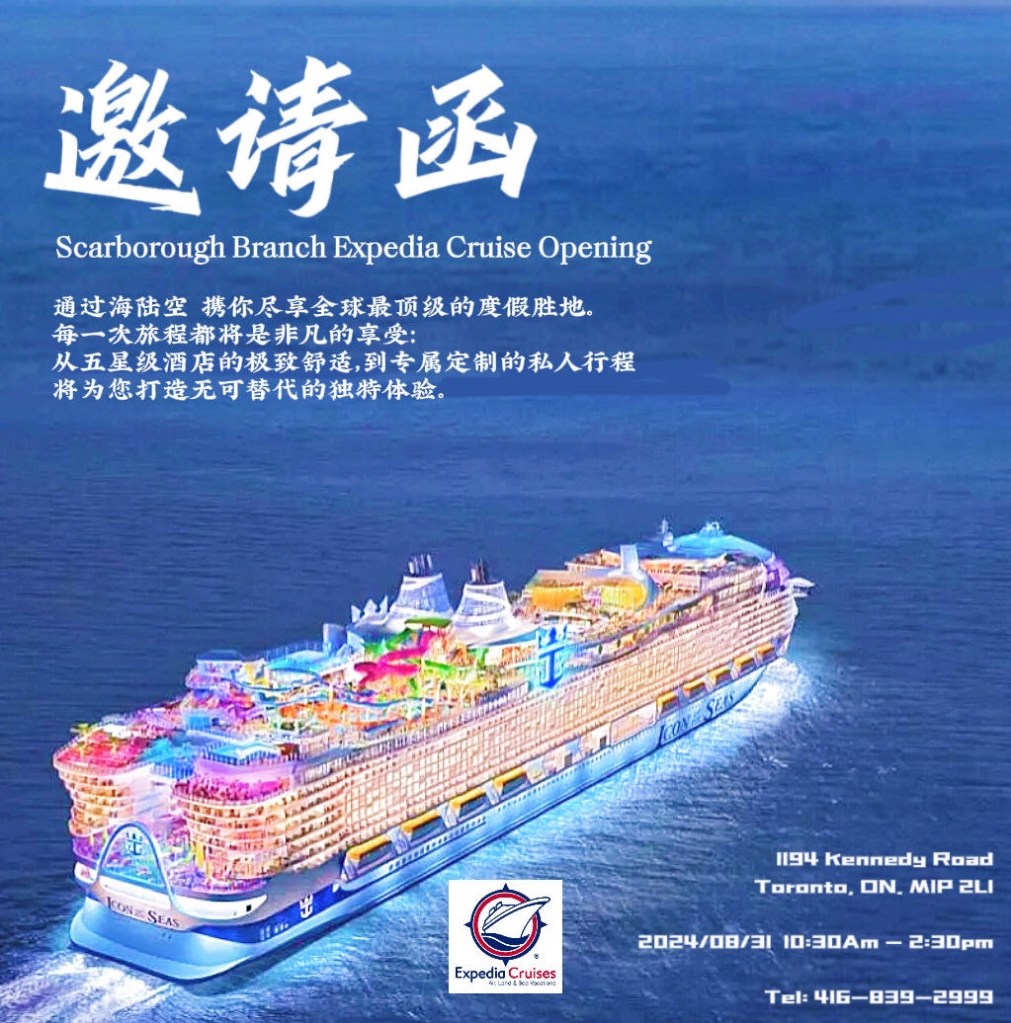 2024/08/31 Expedia Cruise 旅游公司,多伦多士嘉堡分公司隆重开业,这是第一间,也是Expedia Cruise公司内迄 今为止唯一的有中文服务的一间分公司。