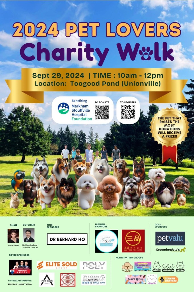 2024年9月29日(星期日),在万锦市的Toogood Pond公园举行了“2024 爱宠慈善结伴行”活动,旨在支持万锦市多福医院基金会(Markham Stouffville Hospital-MSH Foundation)。此次活动由Ginny Chung主办,并得到万锦市区域议员何胡景(Regional Councillor Alan Ho)的联合主办,吸引了众多家庭和宠物参与,既帮助了医院,又增进了社区联系,展现了大家对毛茸茸朋友们的共同热爱。
