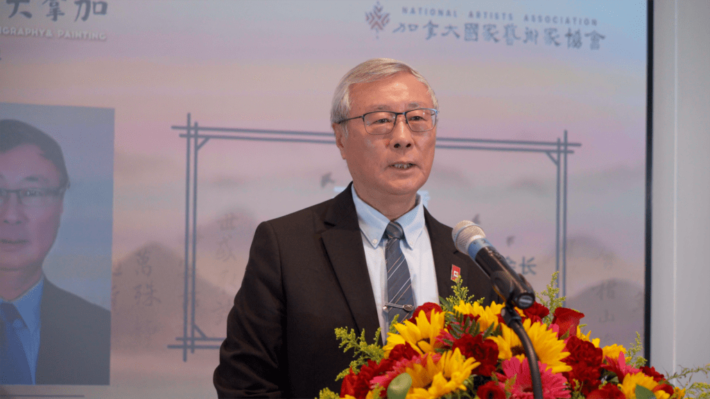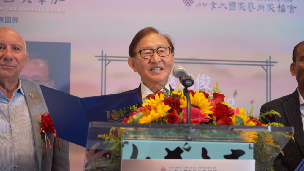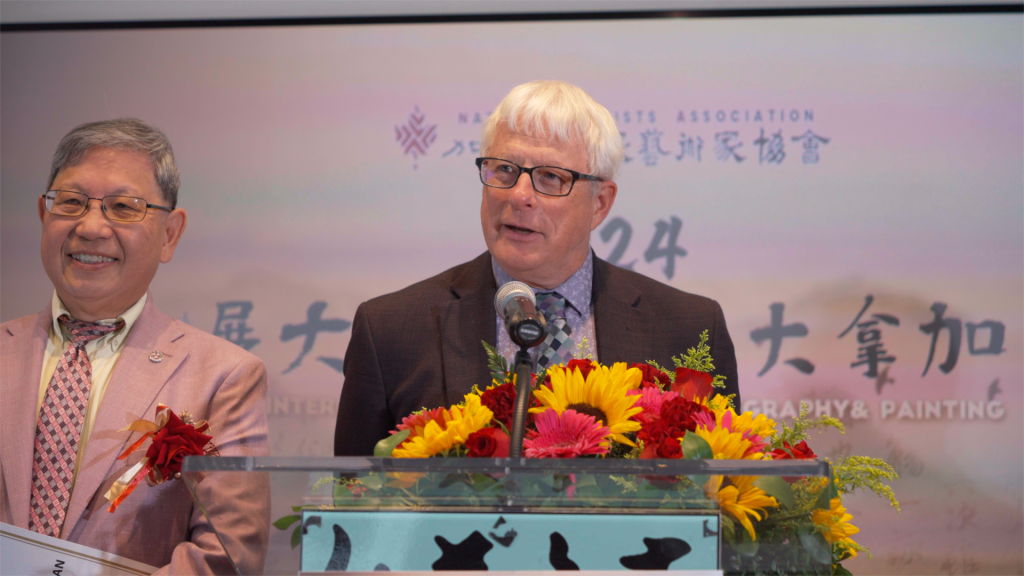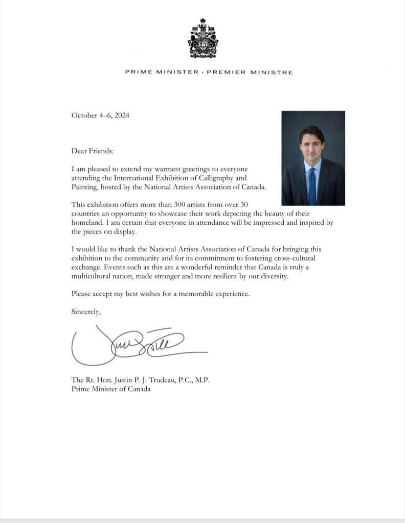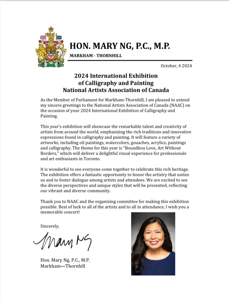 同时,多位加拿大政要和业界知名人士也发来了祝贺视频和贺信,有中国政协委员、中国国家画院原院长卢禹舜和中国国家画院副院长,著名画家范曾侄子范扬发来祝贺视频,还有加拿大总理特鲁多、联邦中小企业部长伍凤仪、加拿大联邦参议员胡元豹,前联邦参议员胡子修、国会议员蒋振宇、陈圣源,马万里、安省议员韦邱佩芳、柯文彬、万锦市市长薛嘉平、万锦市副市长陈国治、约克区域议员何胡景、李国贤,多伦多市议员万利高以及美国北美书画协会等亦发来贺信。