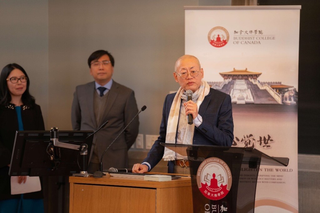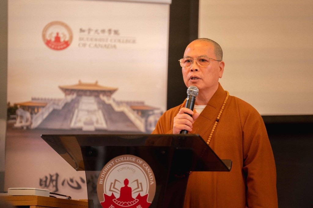 加拿大佛教会会长、加拿大佛学院校董会主席,达义大和尚在致辞中首先代表学院,向来宾以及社会各界表示诚挚的感谢和崇高的敬意。他表示:今天我们非常高兴相聚一堂,共同庆祝本校继续教育项目首届毕业班的顺利毕业。我要感谢Kim- Cragg校长,您的远见卓识使得这个项目成为可能,我们衷心感激您在过去一年的洞察力和指导。我们深信,培养佛教人才至关重要。像这样的项目不仅强调佛教教义的理论,更注重实践,为学生们提供全面的学习体验。