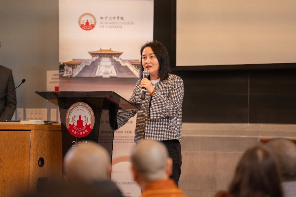 随后,学生Janet Lee分享了她一路见证加拿大佛教会与以马内利学院从零开始建立合作并最终取得成果的全过程。作为一名见证者,她感到无比的欣喜和感动。她深知今天的成就来之不易,背后凝聚了无数人的默默付出。作为首届课程的学员,她倍感自豪,并坦言从中受益良多。
