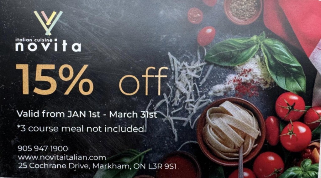Novita Italian Cuisine意大利餐厅座落于万锦和列治文山的中心,拥有得天独厚的地理位置(25 Cochrane Drive, Markham L3R 9S1),沿着Highway7开车过往时,Novita餐厅Logo招牌独特而醒目。走进Novita,整个餐厅在圣诞元素的装点下节日氛围浓郁而温馨。