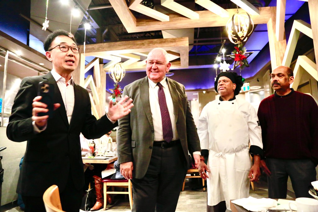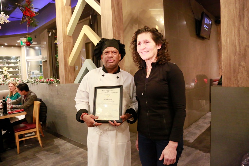 万锦市市长薛家平首先发表致辞向Novita意大利餐厅老板Raj表示祝贺!感谢Novita十年来热情服务广大社区居民,提供正宗的意大利传统美食,让喜欢意餐的食客有口福了!充分肯定Novita十年间为丰富社区饮食文化,以及推动经济发展做出贡献!同时祝福Novita生意兴隆!