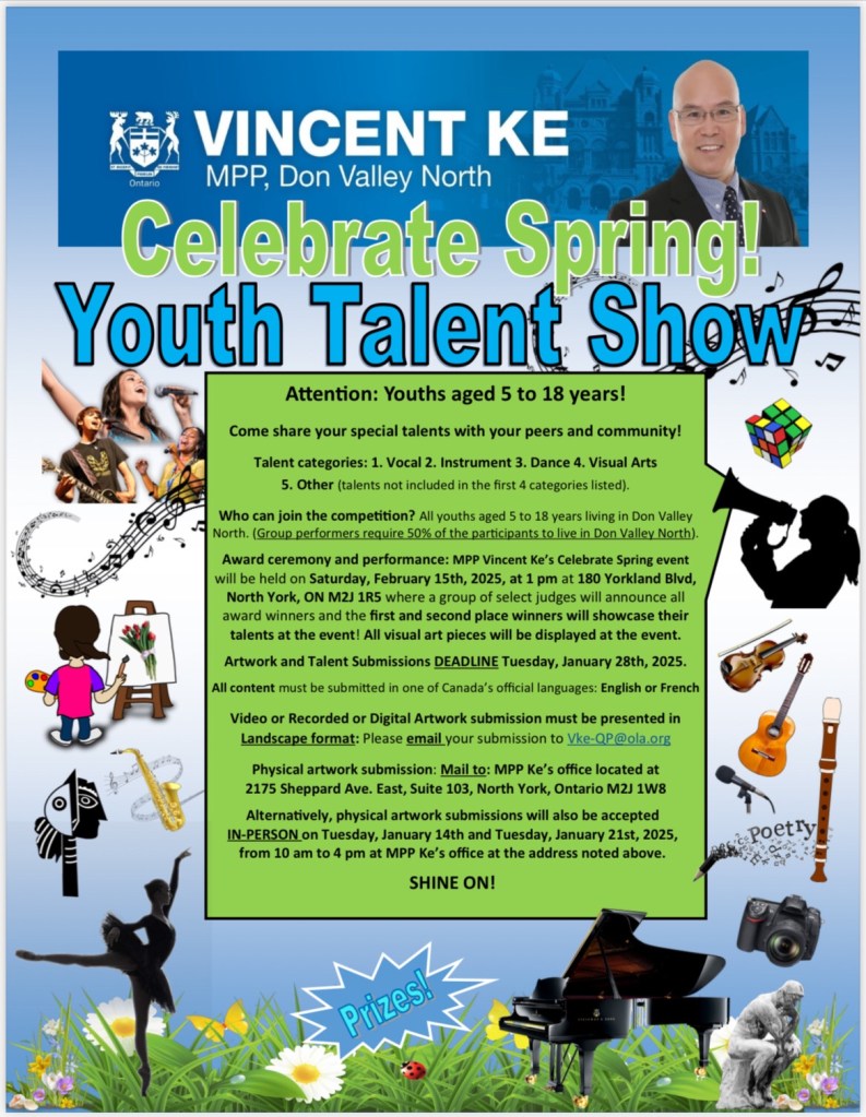 为了给社区青少年提供一个展示才华、交流艺术的机会,当河谷北(Don Valley North)区省议员柯文彬办公室即将举办一场别开生面的青少年才艺大赛,诚挚邀请选区5至18岁的孩子们报名参加,展示他们的艺术天赋与热情,结识有共同兴趣的小伙伴们,用青春活力与创意迎接2025年的春天!