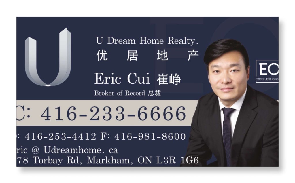 Eric Cui (优居地产总裁)是一位拥有三十多年地产经验的资深房产中介,他的公司「优居地产」从顶级的千万豪宅到普通的小康之家,丰富的房源和客源,买家和卖家,优居地产都将是你们成功的首选。