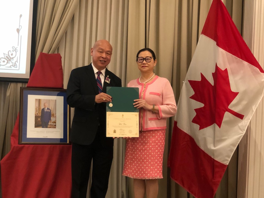 范伟(Wei Fan),加拿大客家协会名誉主席,长期支持教育与社会福利,其妻子代为领奖。
