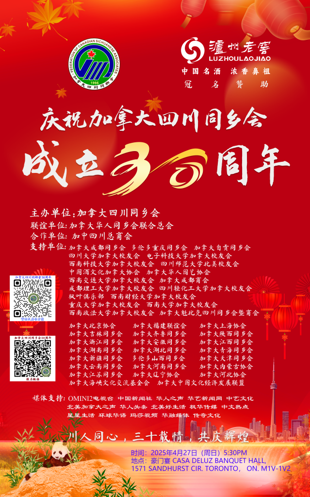 我们诚挚邀请您4月27日莅临盛典现场,一同见证加拿大四川同乡会的辉煌时刻,回顾过去三十载的奋斗历程,共同展望更加美好的未来!