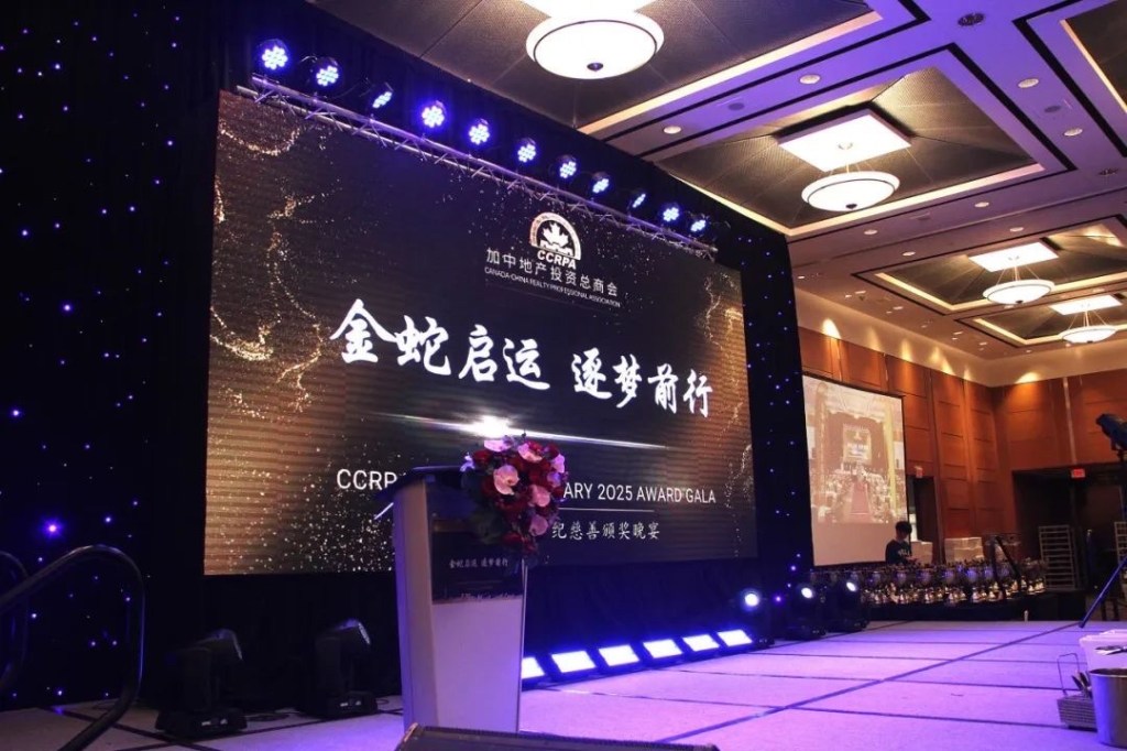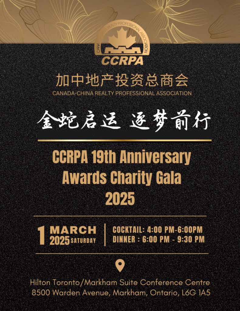 加中地产投资总商会(CCRPA)于 2025年3月1日,举办一年一度有地产界“奥斯卡颁奖晚会”之称的顶尖经纪慈善颁奖晚宴(CCRPA 19th Anniversary Awards Charity Gala)。有近千名优秀的地产经纪,房地产开发商,房地产投资人,金融名家,投资商,政界代表,社团侨领参加这一盛会,内容包括表彰优秀、慈善捐助、商会精英交流及文艺表演等。本次晚会的首席赞助商是加拿大道明银行(TD Canada Trust)