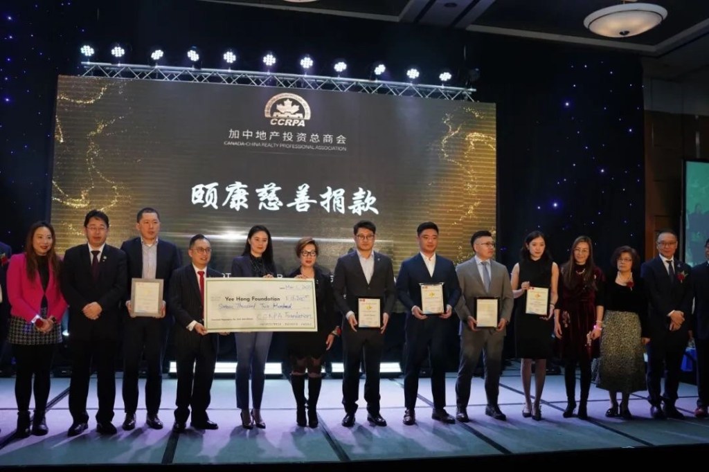 此外,CCRPA还举行了公益活动为颐康慈善筹款,前会长孙志峰、加拿大地产协会区域董事WinsonChan和颐康(YEE HONG)代表等一同上台,启动当晚的筹款环节,现场共筹得善款$16,800,展现了商会回馈社区的积极行动。