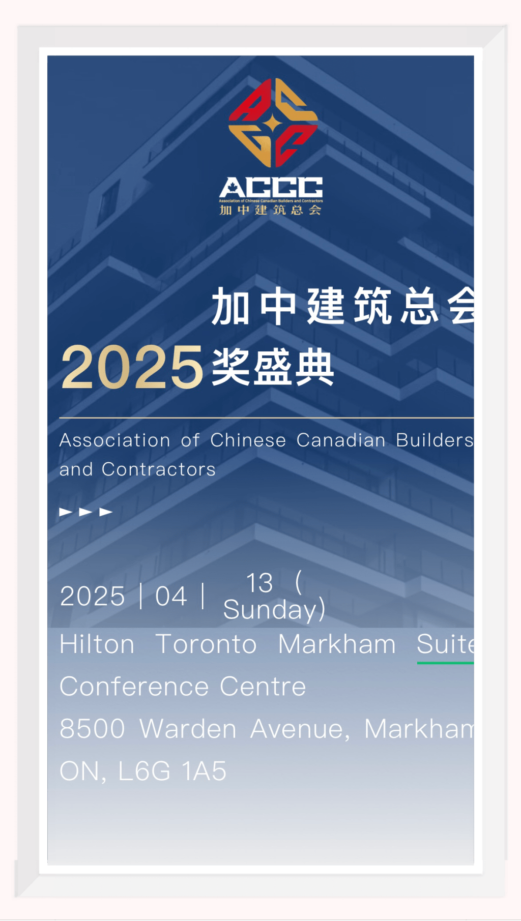 2025加中建筑总会年度颁奖盛典将于2025年4月13日(周日)在万锦希尔顿会议中心隆重举行。本次盛典作为加拿大华人建筑界的顶级盛会,将汇聚来自政府政要、行业精英、商业翘楚,共同见证建筑领域的辉煌成就与未来展望。