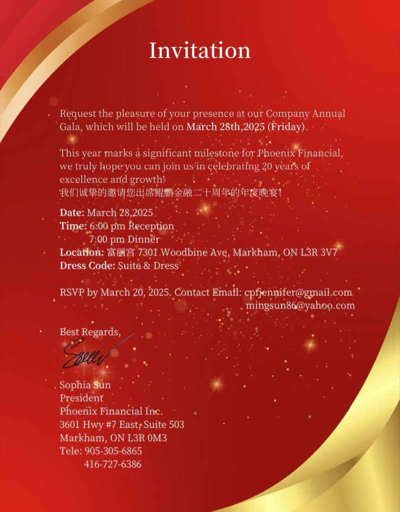 2025 年 3 月 28 日,鲲鹏金融公司(Phoenix Financial)在多伦多富丽宫举办了公司成立二十周年庆典。众多业界领袖、商业精英、合作伙伴及客户出席晚宴,共同见证鲲鹏金融在过去 二十 年里取得的辉煌成就,展望未来的美好愿景。