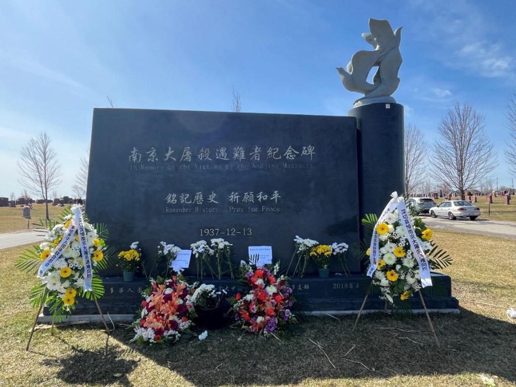 多伦多华联总会副主席王清官、陈福、刘莹、林健全,秘书长周捷,常务理事梁梅英、沈谢元代表华联总会和总会翁国宁主席向【南京大屠杀遇难者纪念碑】敬献了花圈和鲜花,并集体向纪念碑三鞠躬,表达对30万南京大屠杀死难同胞最深切的哀悼和对和平的祈愿。