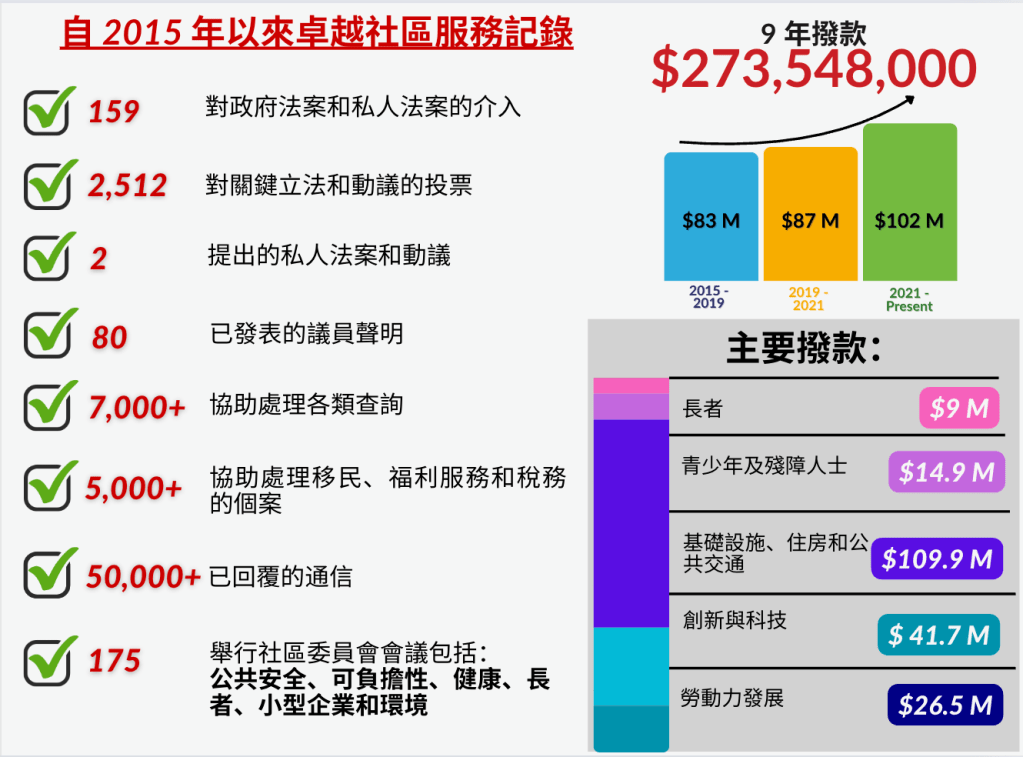 过去十年来,马万里为列治文山南区带来具体成果,包括: