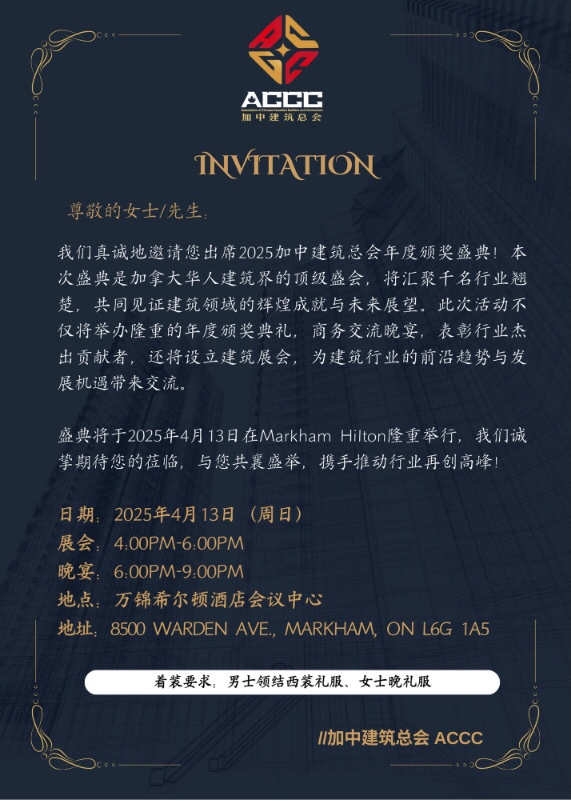 2025年4月13日(周日),2025加中建筑总会(ACCC)年度颁奖盛典在万锦希尔顿会议中心隆重举行!这不仅是一场建筑行业的盛宴,更是一场彰显荣耀与梦想的璀璨夜晚!