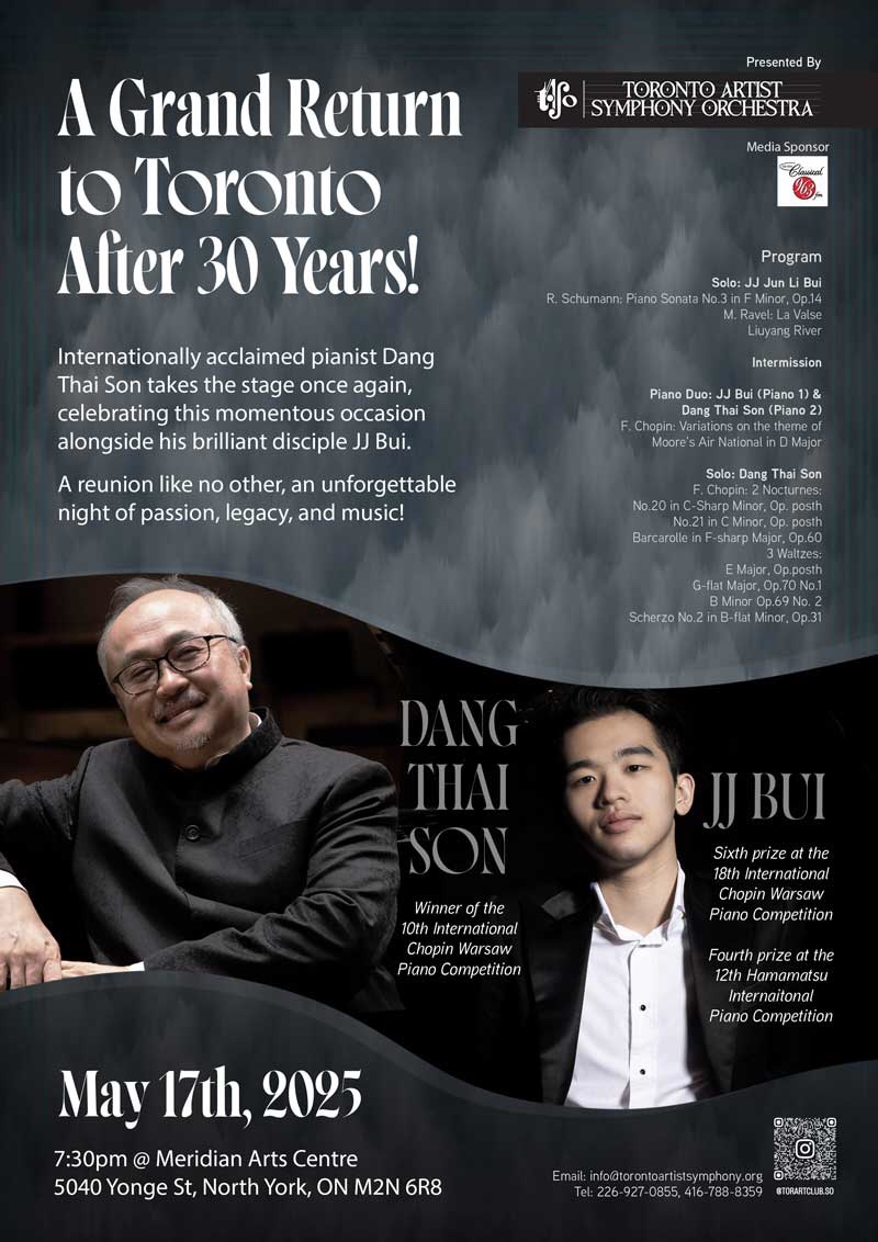 当传奇与新星的琴音交织,浪漫主义的旋律将在多伦多上空再次回响。2025年5月17日晚,加拿大越南裔钢琴大师 邓泰山(Dang Thai Son) 将携手其爱徒、青年钢琴家白立君(JJ Bui),为多伦多观众献上一场穿越世代、融汇古典与现代的钢琴盛宴。同时,邓泰山还将举办大师课,亲授琴艺心得。