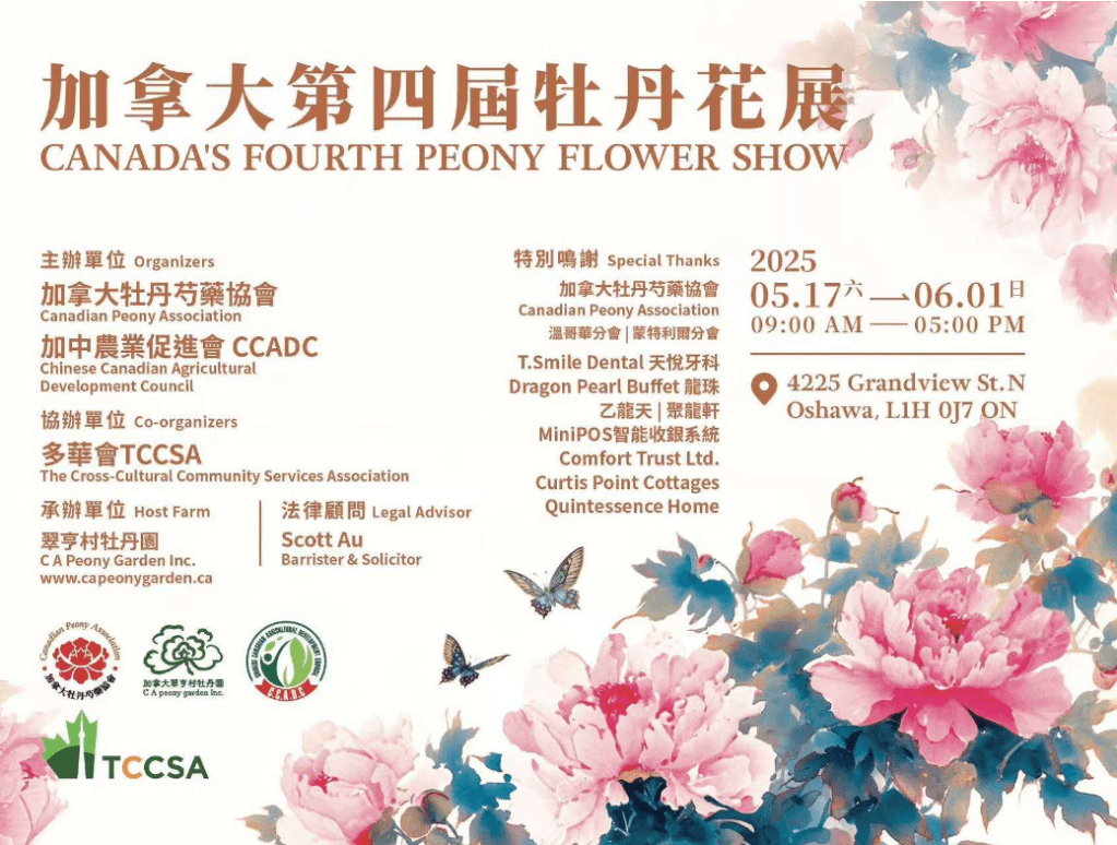 第四届加拿大牡丹花展由加拿大牡丹芍药协会和加中农业促进会联合主办,多华会协办,于2025年6月1日在Oshawa翠亨村牡丹园隆重开幕。在牡丹盛放、春意盎然的初夏,盛花时节的园区姹紫嫣红、花香四溢,吸引了大批游客与媒体前来共赴花海的盛宴。