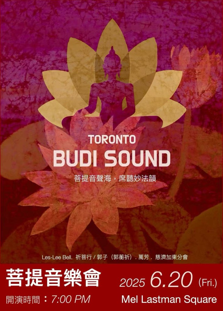 多倫多首次以佛教、心靈、愛為主題的音樂會_BUDI SOUND (菩提音樂會),即將在6/20(五)在Mel Lastman Square的舞台,在仲夏之夜,藉由頌缽的共振禪音、新世代音樂的佛曲心咒、溫暖慈悲的手語演繹,將菩提之愛藉由音樂傳達給與會大眾。