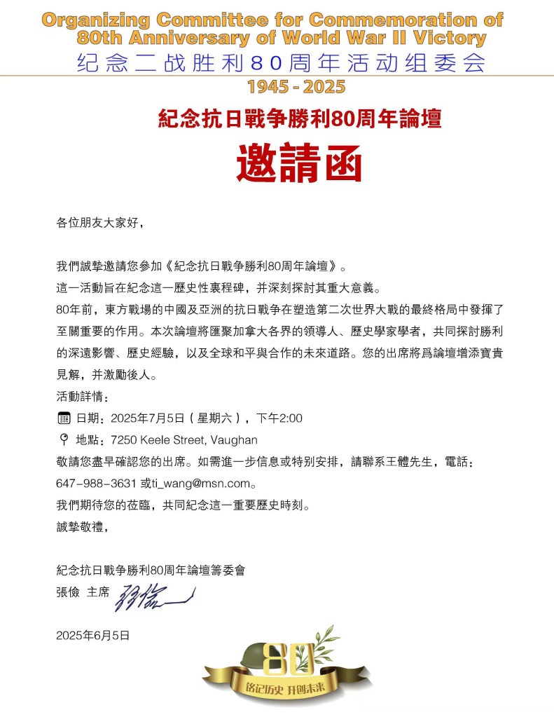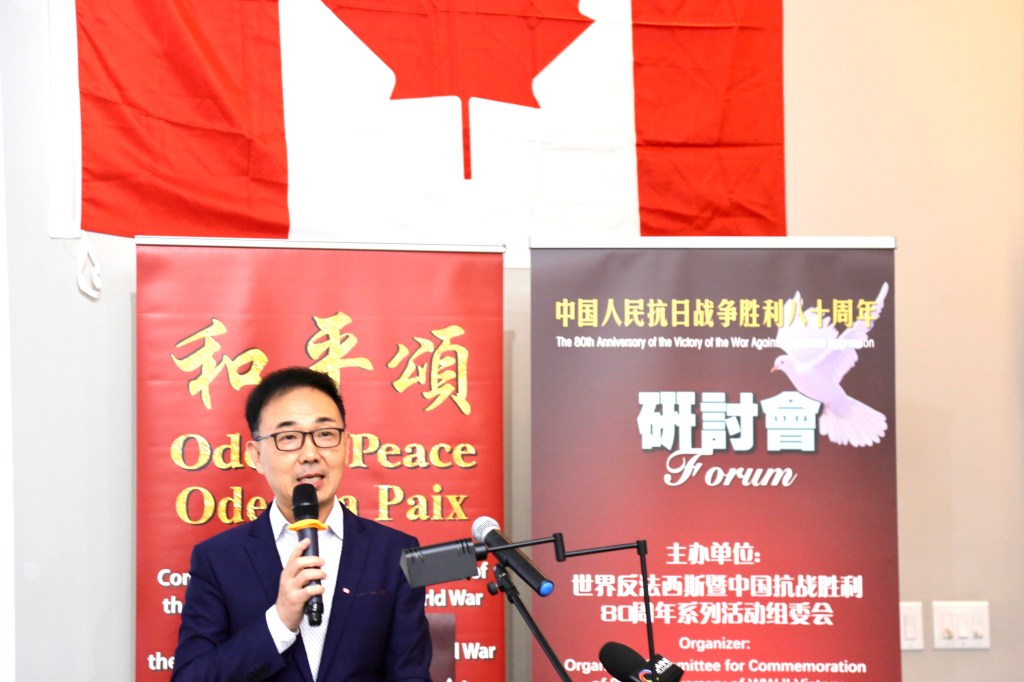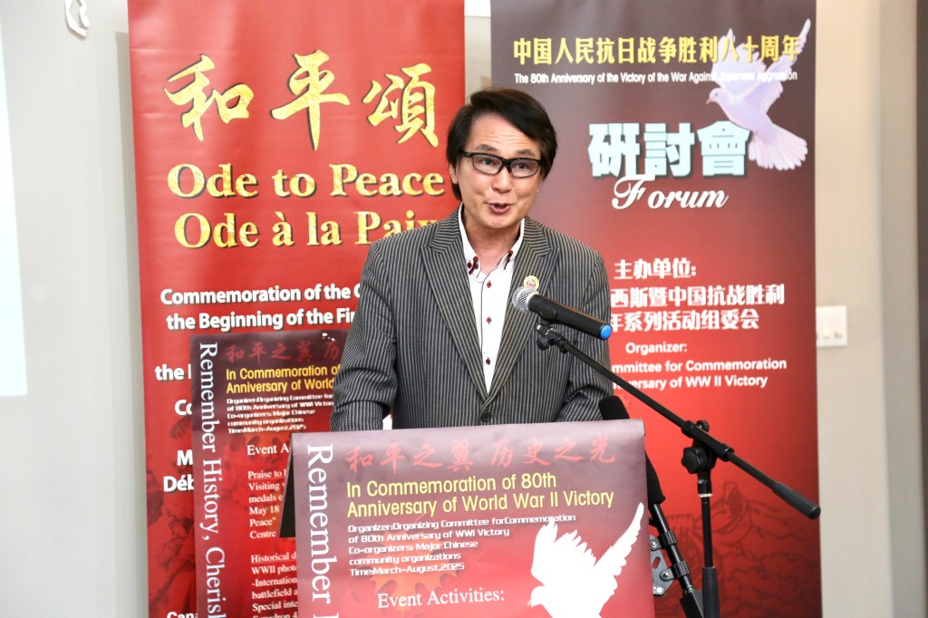 7月5日,由世界反法西斯暨中国抗战胜利80周年系列活动组委会与加拿大华人同乡会联合总会联合主办的“历史回顾研讨会与抗战历史图片展”在大多伦多地区旺市隆重举行。