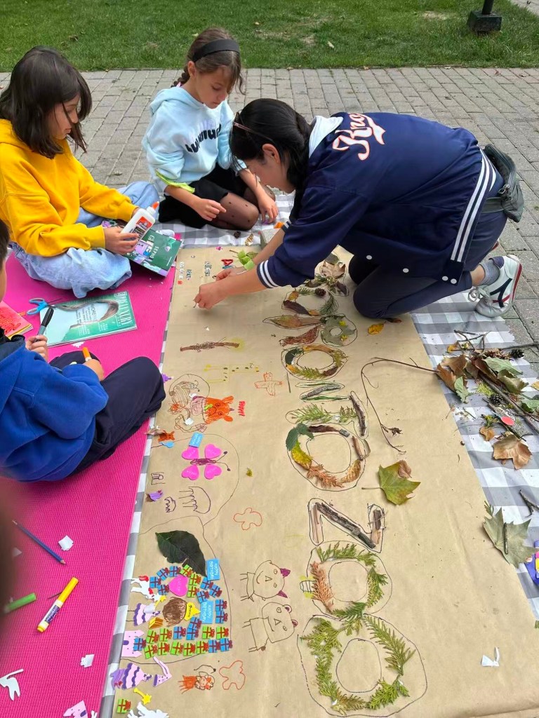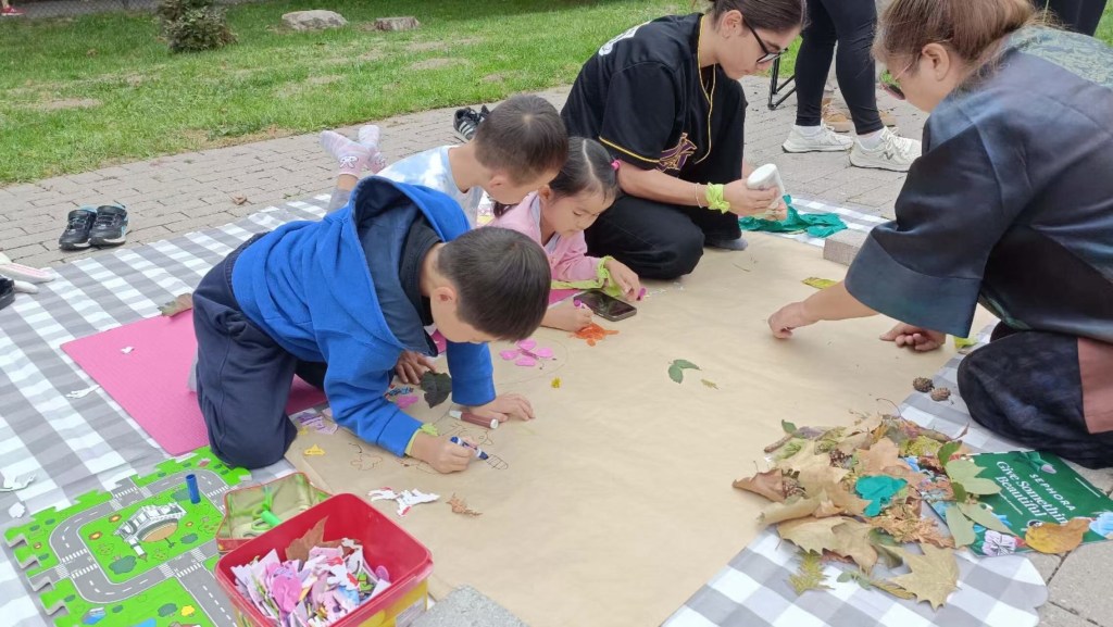 与此同时,另一组孩子在指导老师和阿塞拜疆义工的带领下,利用树叶、废旧杂志等环保材料共同制作出一幅巨型手工拼贴作品《多伦多动物园》。