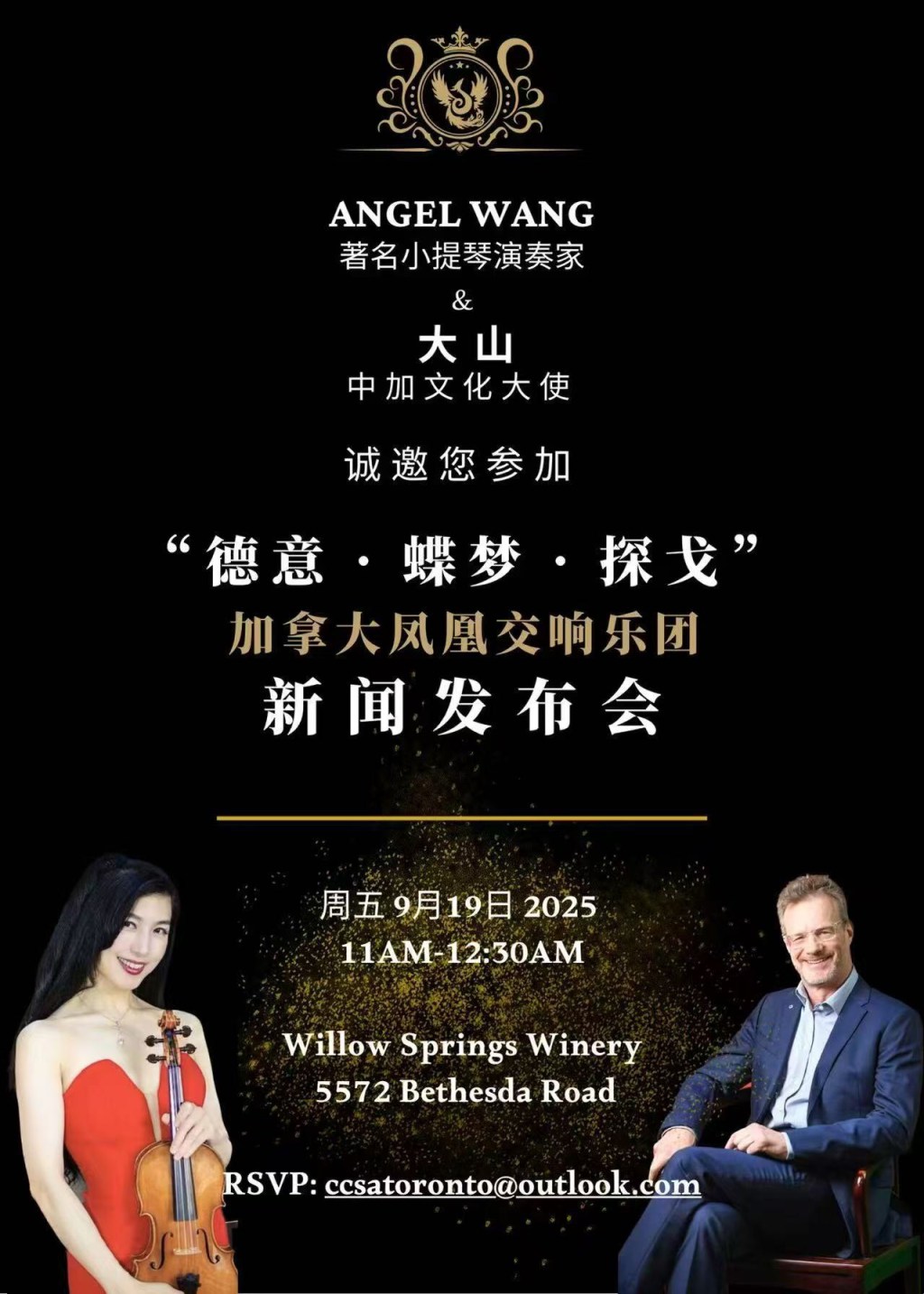 享誉盛名的加拿大华裔小提琴演奏家 Angel Wang 9月19日于柳泉酒庄召开盛大新闻发布会,宣布她即将于10月24日隆重举行的独奏音乐会。由她创立并担任艺术总监的加拿大凤凰交响乐团,将和中加大使大山合作,呈现一场耳目一新的丝弦交响音乐会“德意·蝶梦·探戈” ( Berlin•Butterfly•Brazil),引领观众踏上一段跨越时空的音韵华章。