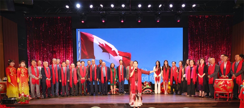 至此,晚会进入“历史回望”篇章。灯光渐暗,在一曲颂歌向新中国76岁华诞致敬后,《加中建交55周年回顾视频》首先播放,观众在光影中重温加拿大与新中国建交后半个多世纪以来两国友好交往的历程。