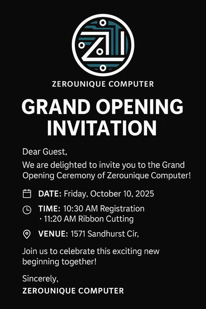 多伦多知名Zerounique Computer 公司位于1571 Sandnhurst Cir 商场的第四家分店10月10日隆重开业。 当天,政商界和社区侨领 ,合伙人,赞助商及众多亲朋好友 出席了开业典礼。 其中,多伦多23区士嘉堡北市议员麦智谋(Councillor Jamaal Mamasl);York 区区 域议员何胡景(Alan);万锦市市议员杨绮清 (Amanda);著名画家,联合国艺术大使,列志文山市文化大使何靖 垣(William) ;合作伙伴及冠名赞助商宏博留学移民中心执行董事 Halle女士等亲临现场致贺。列志文山市市议员崔冰辉(Simon 崔) 发来贺函。