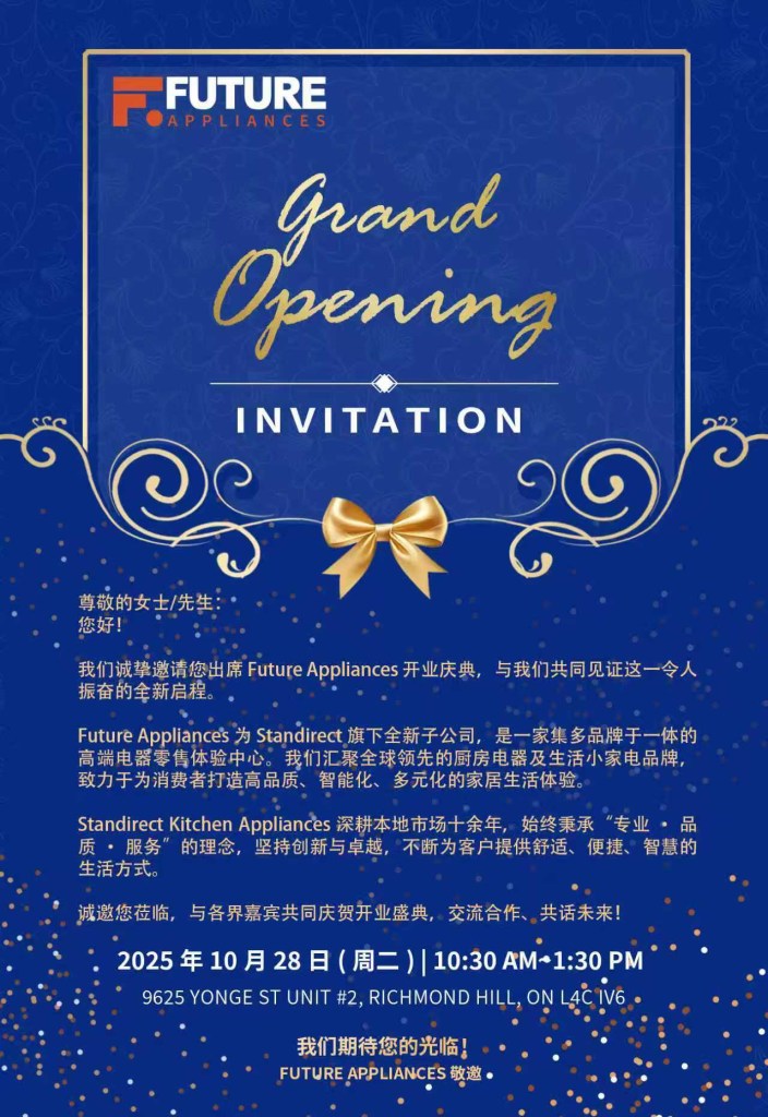 2025年10月28日,坐落于 Yonge St Weldrick Rd E 的多伦多华人最大高端家用电器体验中心~Future Appliances 隆重开业。来自加拿大三级政府的官员、合作伙伴、商界精英、行业专家及媒体代表等近300位嘉宾出席,共同见证这一重要时刻。