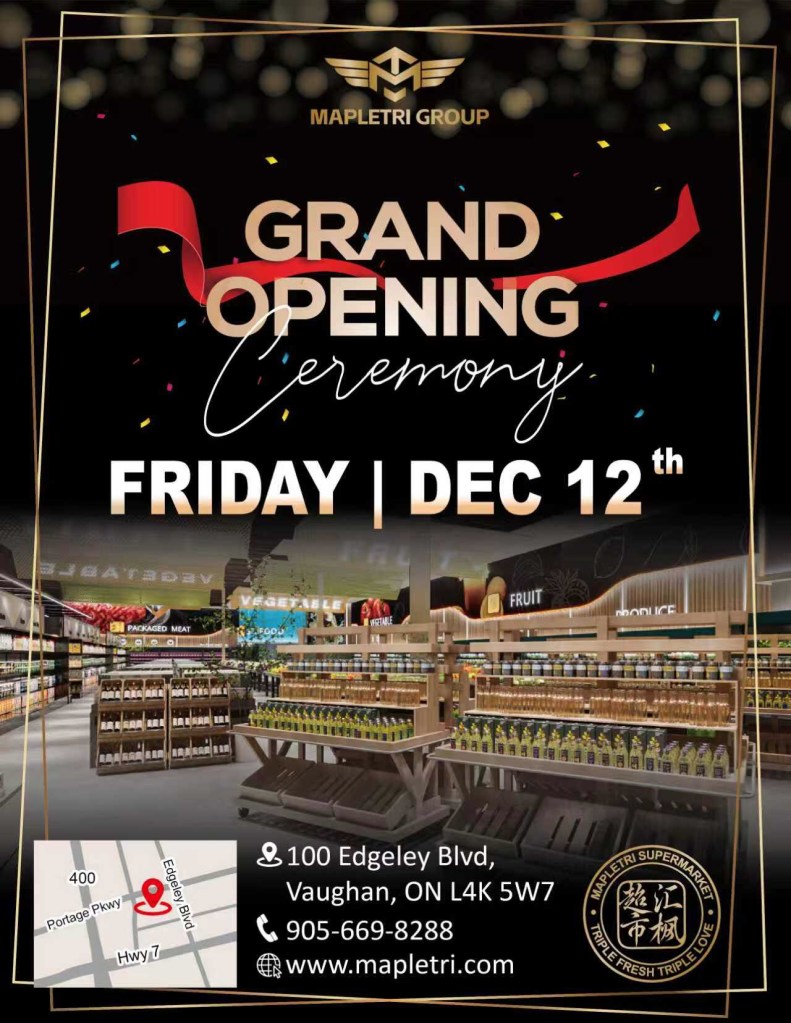 2025年12月12日,MapleTRI 集团旗下旗舰项目——汇枫超市(MapleTRI Supermarket)在旺市 100 Edgeley Blvd, Concord 隆重开业。政要嘉宾、社区领袖、合作伙伴及多家媒体齐聚现场,在锣鼓喧天、舞狮腾跃与剪彩揭幕的热烈氛围中,共同见证旺市全新生活方式地标正式亮相。