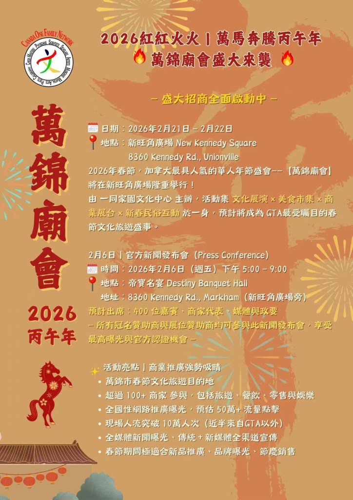 在2026年2月6日的十週年庆典晚会上,我们将颁奖颁奖表彰耕耘艺术的文化达人、长期支持中心的赞助商、杰出贡献的社区领袖。 也同时是春节万锦庙会活动(2月21-22)新闻发布会。届时政要云集,商界联动,将共同表彰颁奖。