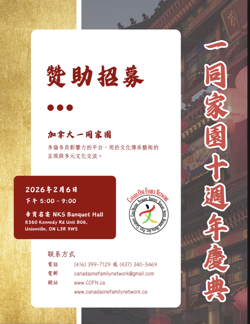 2026/02/06 加拿大一同家园文化中心将举办成立十週年慶典,藉此感谢十年来一直相互扶持与合作的伙伴们。因为有你们的支持,我们才能够帮助社区文化发展共同成长,坚持到底。