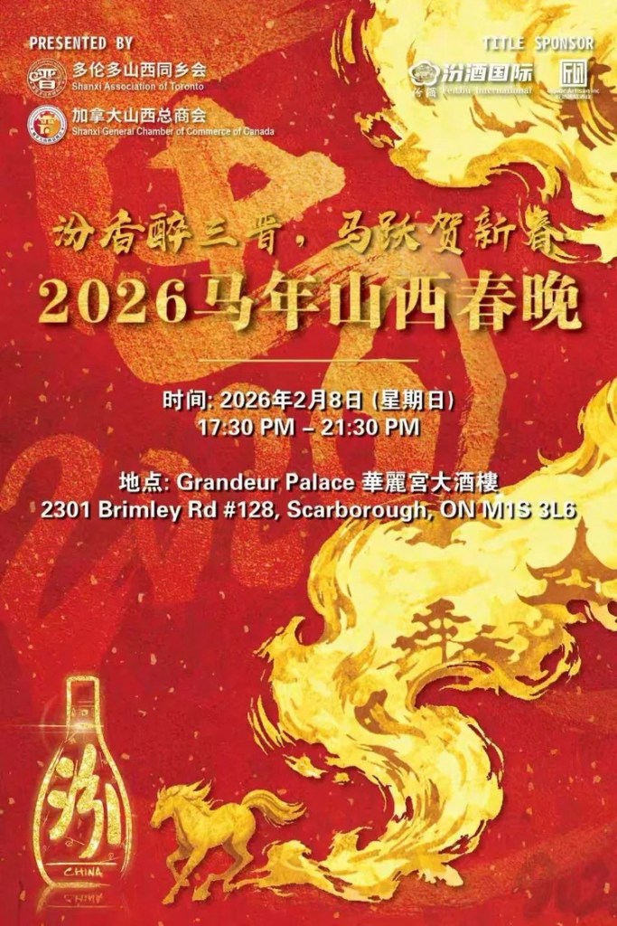 这是汾酒国际继2023 /2024 / 2025连续三年赞助多伦多山西春晚之后,再一次与多伦多山西同乡会携手主题赞助~2026丙午马年多伦多山西春晚。
