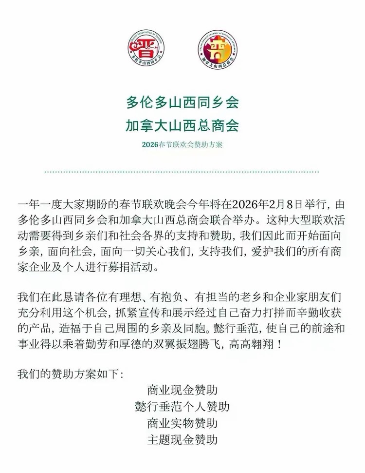 2026多伦多山西春晚赞助商 :Jan 7 2026