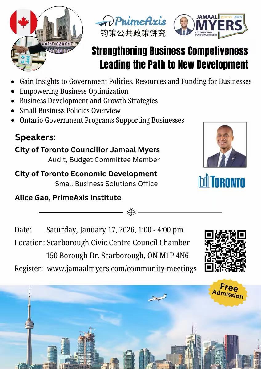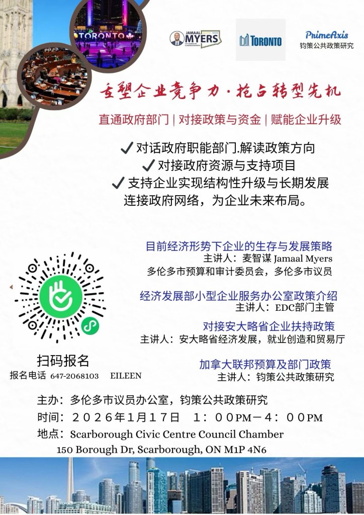 「2026/01/18多伦多讯」由多伦多市23区士嘉堡北市议员麦智谋和多伦多钧策公共政策研究机构 举办的加拿大政府商业资讯讲座1月17日在多伦多士嘉堡市政中心(Scarborough Civic Centre Council Chamber 150 Borough Dr , Scarborough , ON, M1P 4N6 )成功举办。