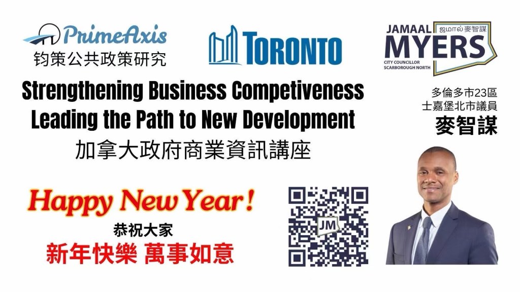 「2026/01/17 多伦多讯」由多伦多市23区士嘉堡北市议员麦智谋和 钧策公共政策研究机构 举办的加拿大政府商业资讯讲座1月17日在多伦多士嘉堡市政中心(Scarborough Civic Centre Council Chamber 150 Borough Dr , Scarborough , ON, M1P 4N6 )成功举办。