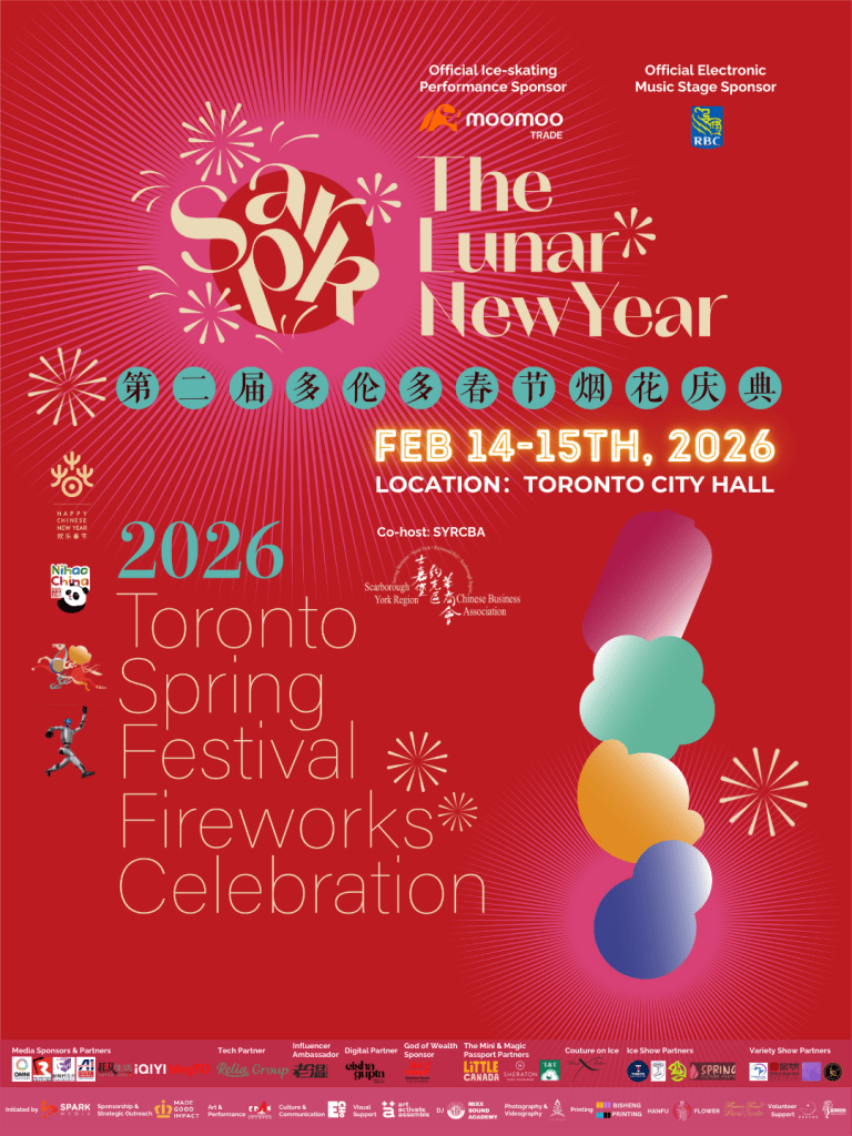 作为加拿大唯一在核心地标公共户外空间举办的农历新年烟花盛事,今年的庆典在首届成功的基础上实现了跨越式升级,并荣幸的得到了中国驻多伦多总领事馆以及中国驻多伦多旅游办事处的大力支持。作为欢乐春节的系列节目之一,TSF组委会将致力于为全城观众呈现一场连续两天不间断的感官盛宴。值得一提的是,本届活动得到了顶级合作伙伴的鼎力支持:RBC(加拿大皇家银行)作为电音舞台赞助商(Electronic Music Stage Sponsor),将为中央舞台注入强劲活力,呈现更加璀璨夺目的多元文化演艺;而富途Moomoo则将作为冰上表演赞助商(Ice-skating Performance Sponsor),特别呈献令人耳目一新的冰上大秀,在市政厅的冰场上为观众带来动感与美感交织的视觉奇观。士嘉堡约克区华商会 (SYRCBA) 作为Co-host,也会在2.15日开展新春团拜活动。