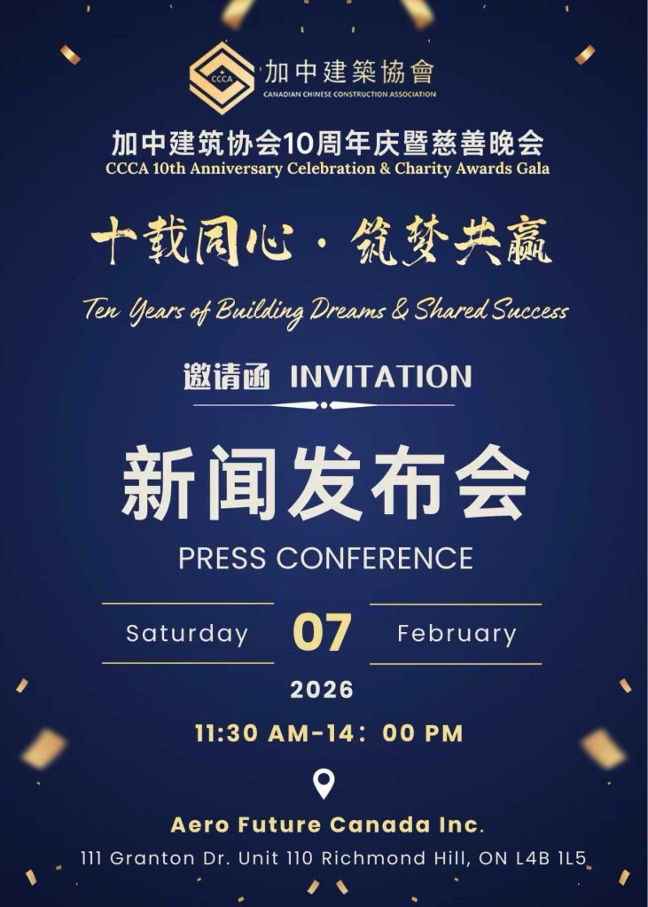 加中建筑协会(Canadian Chinese Construction Association,简称 CCCA)今日正式宣布,将于2026年3月7日(星期六)在万锦希尔顿会议中心(Hilton Toronto Markham Suites Conference Centre)隆重举办加中建筑协会成立十周年庆典暨慈善颁奖晚会。本次盛会以“十年同心,筑梦未来”为主题,系统回顾协会成立十年来在促进加中建筑行业交流合作方面取得的丰硕成果,并共同展望行业未来发展新机遇。