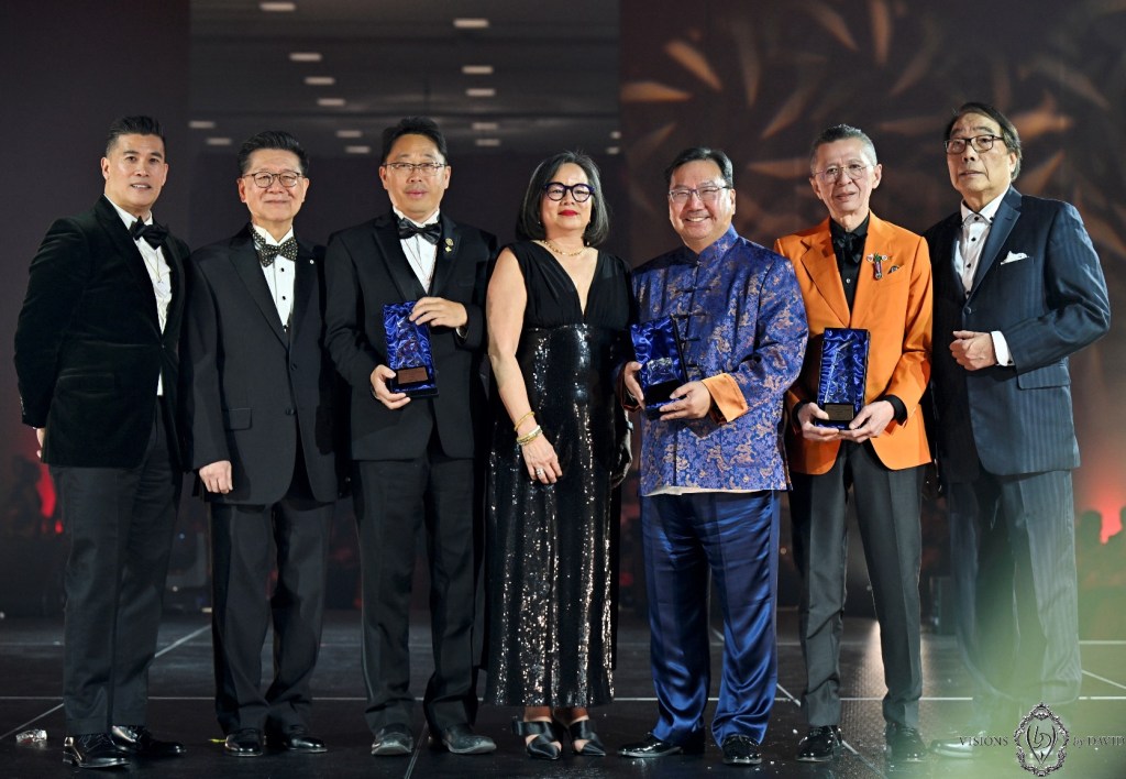 頤康基金會於晚宴上特別頒發頤康「金色成就獎」,表彰三位傑出善長,包括今屆晚宴籌委會主席兼榮譽贊助人、FAW Group總裁林耀西 (David Maung)(右二),以及晚宴共同主席溫建業特許會計師(右三)和加中地產投資總商會會長孫志峰(左三)