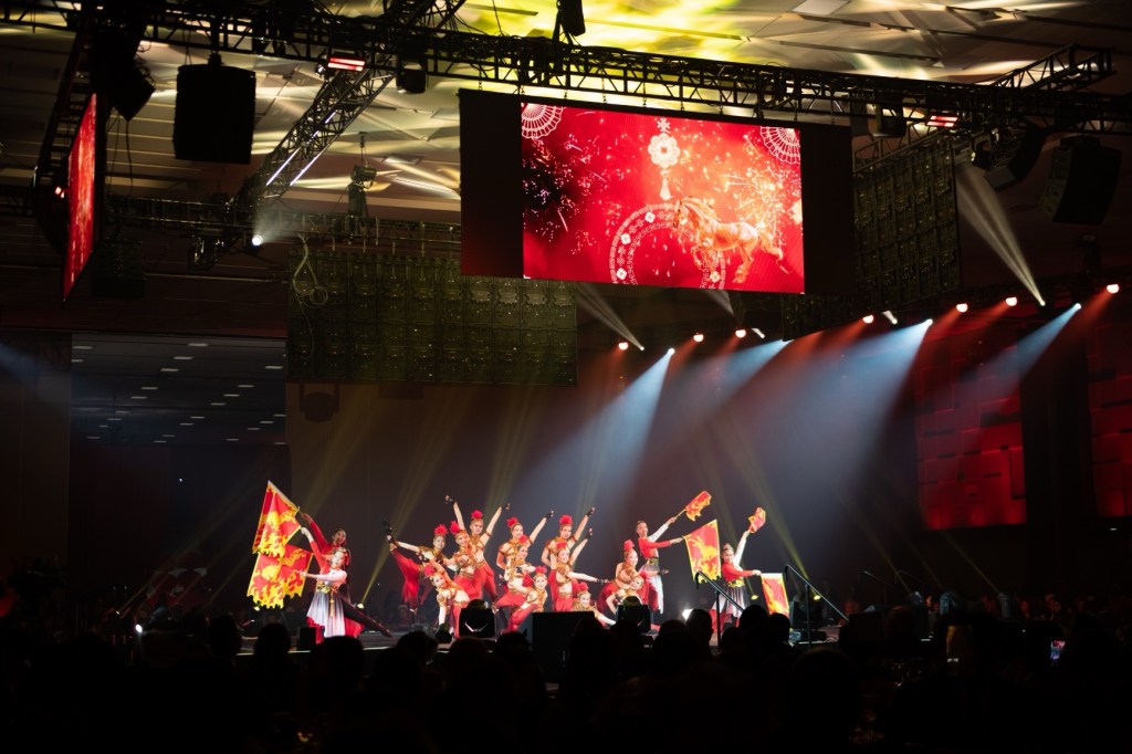 今年晚宴因嶄新的中央舞台佈局而氣氛熱烈、掌聲不絕,四周的 LED 大屏幕更讓在場每位賓客都能近距離感受舞台上的每一個精彩瞬間。開場由 Wushu Project 帶來動感十足、氣勢磅礡的現代版舞龍、舞獅、舞麒麟賀歲表演。隨後,菁華藝術協進會帶來充滿活力且富有文化韻味的民族舞蹈《奔騰的小馬》,呼應農曆馬年。來自香港的無伴奏合唱團 Brio 以純人聲呈現層次分明、豐富音樂感的合唱作品,包括多首應節情歌。晚宴壓軸表演由曾榮獲多項國際獎項的加拿大本地藝人Carla Sacco帶來優美動聽的西方情歌。