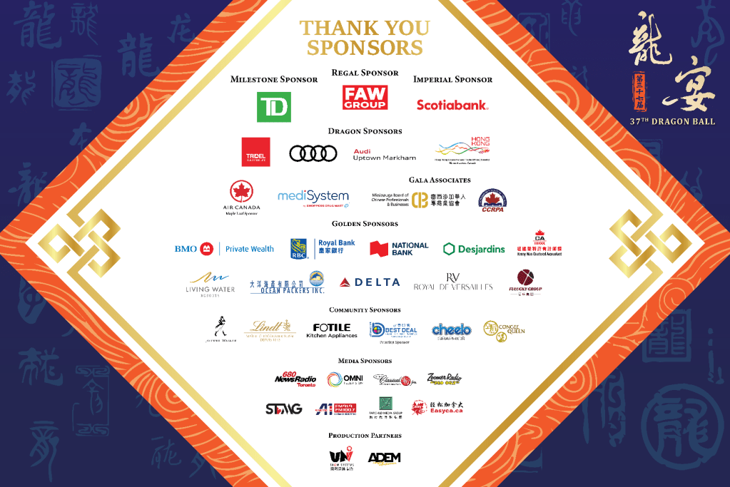 頤康基金會衷心感謝社區各界長期以來的支持與信任,以及眾多義工默默付出。第37屆「龍宴」得以圓滿舉行,有賴各主要贊助商鼎力相助,包括FAW Group、TD道明銀行、Scotiabank豐業銀行、Tridel、Audi Uptown、Air Canada加拿大航空、香港駐多倫多經濟貿易辦事處和MediSystem。