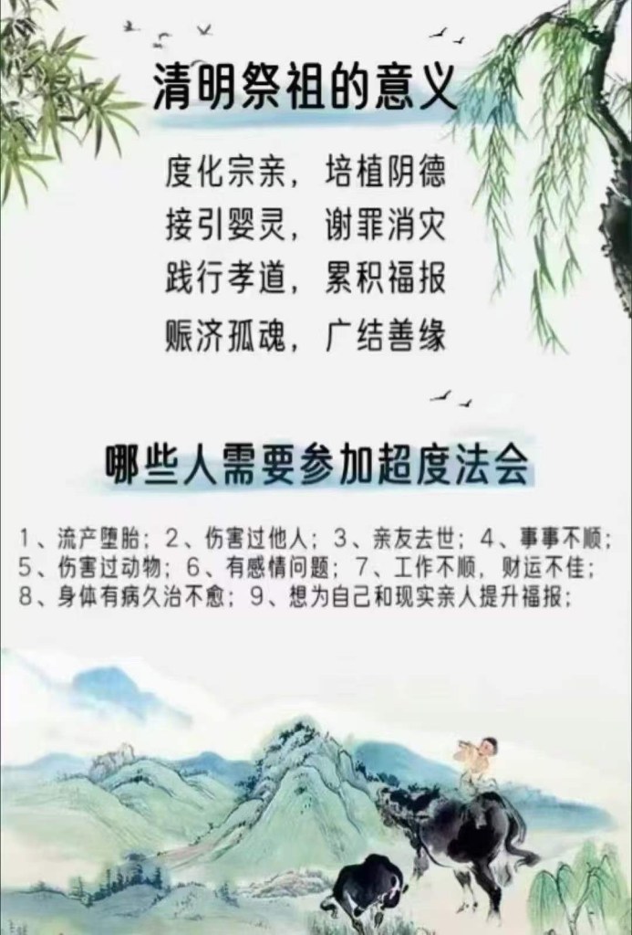 清明,取天清地明之意。饮水思源、慎终追远、孝亲报恩,是中华民族优良传统。一个“孝”字,将清明节和佛教紧紧地联系在了一起。扫墓祭祖、寄托哀思,以缅怀先人,这是千百年来留下的优良传统,更深藏着中华民族生生不息的精神密码。感念先人恩德、悲悯无形众生,在这天举行清明法会,既可利益先人、无形众生,也为行者清净宿业、积累福德资粮。