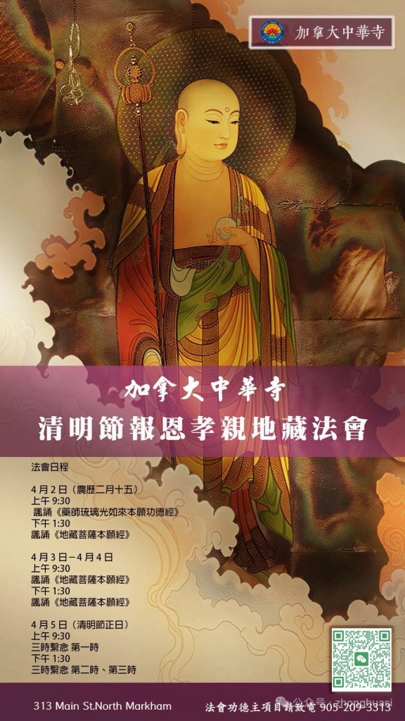 加拿大中华寺将于四月二日至五日举行《地藏菩萨本愿功德经》暨《三时系念》法会回向超荐历代父母、宗亲,往生净土、莲品增上;并且回向健在父母双亲、师长身体健康长寿、恒久住世,六亲眷属平安顺利吉祥!