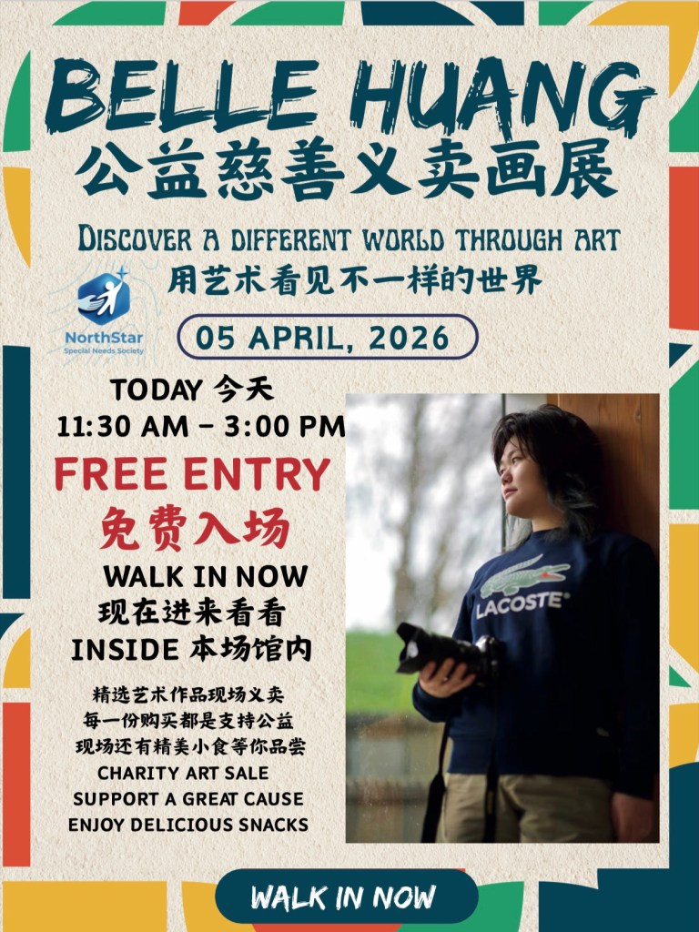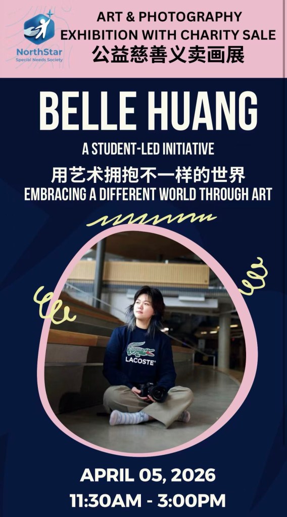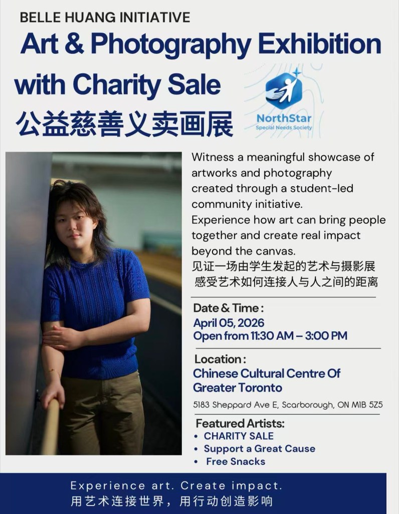 4月5日,由加拿大高中生Belle Huang发起的「Art & Photography Exhibition with Charity Sale(艺术与摄影公益义卖展)」在大多伦多中华文化中心举办。本次展览不仅展示其个人艺术创作成果,更以公益为核心,所有义卖所得将用于支持特殊群体及相关特殊需求支持项目。